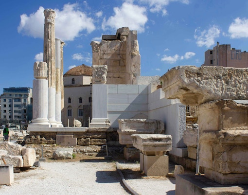 Passeggia tra i resti del mercato romano di Atene, tra cui l'iconica Torre dei Venti e le antiche colonne.