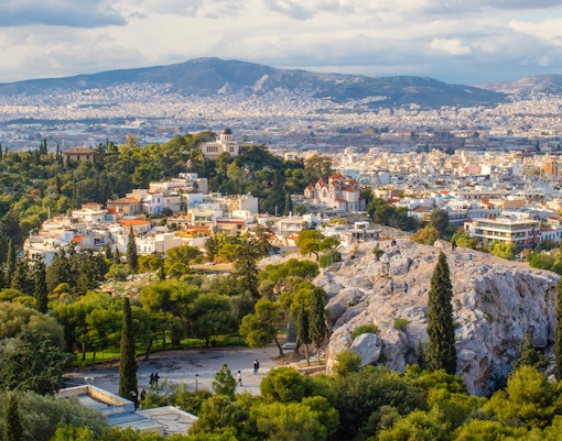 Una breve ma ripida scalata per raggiungere una piattaforma rocciosa che domina l'Acropoli e lo skyline della città.