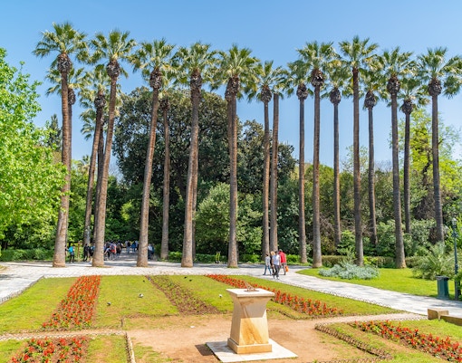 Eleganti giardini che circondano la Sala Zappeion, con fontane, statue e panchine tranquille.