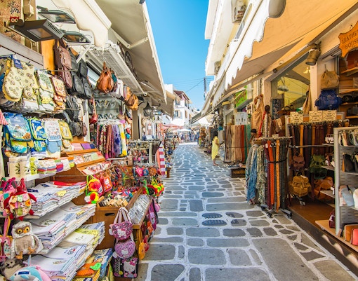 Una stretta strada pedonale a Monastiraki, piena di bancarelle che vendono gioielli, cappelli e souvenir.
